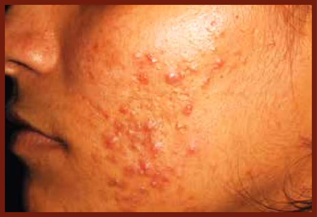 Acne (pimples) is an inflammatory skin disease, primarily involving sebaceous glands; affecting the face, but can also occur on the arms, back & chest.