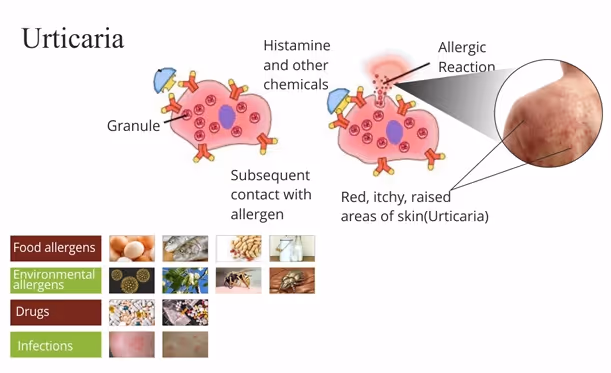 Urticaria is caused by release of a chemical called histamine, which causes itching,redness and swelling of the skin. In most cases, the lesions appear suddenly disappear within several hours